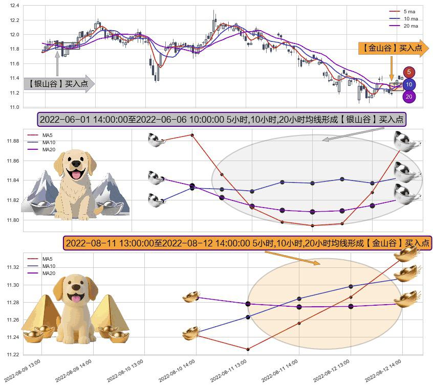 ⚄ 2022-08-11 14:00:00-小时至2022-08-12 14:00:00-小时显现 5小时-10小时-20小时均线 【金山谷】买入点 其再次确认了买入信号,可靠性更强,买入