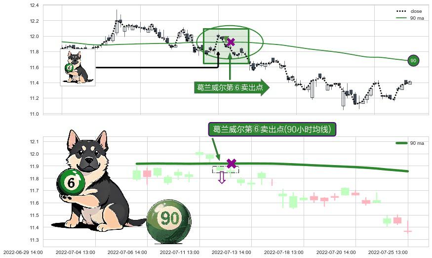 ⚀ 2022-07-12 13:00:00-小时显现 葛兰威尔均线 90小时均线 第⑥卖出点 走势反转见顶信号,后市看跌,卖出信号