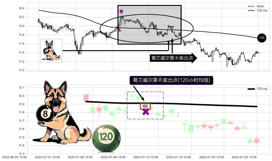 ⚀ 2022-07-12 13:00:00-小时显现 葛兰威尔均线 120小时均线 第⑧卖出点 下降趋势的中继信号,后市看跌,卖出信号
