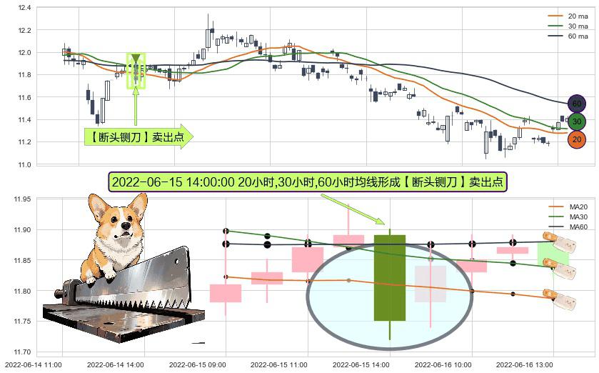 ⚀ 2022-06-15 14:00:00小时显现 20小时-30小时-60小时均线 【断头铡刀】卖出点 看空信号,后市看跌,卖出