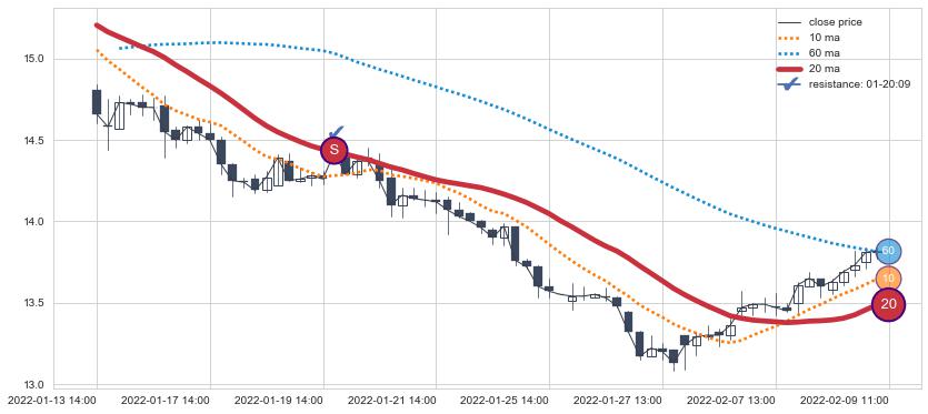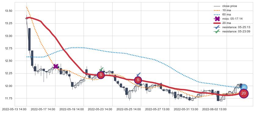 ⚂ 2022-06-21 14:00:00-小时均线向上突破,2022-07-12 13:00:00-小时重新下穿均线破位,均线阻力再次生效