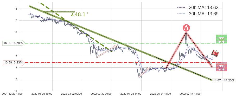 ♘ 阻力价格位15.06,可信任强度50.26%,距离最后交易2022-08-12 14:00形成的收盘价格13.84相差 +8.79%
