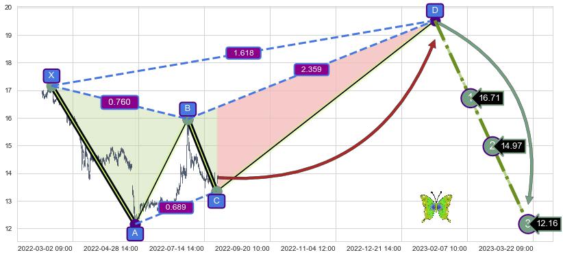 ➣ 未完成【蝴蝶】形态起点X: 02-11:11, 已到达C点: 08-10:14, 预测最终D点: 01-13:14, 共1164交易小时