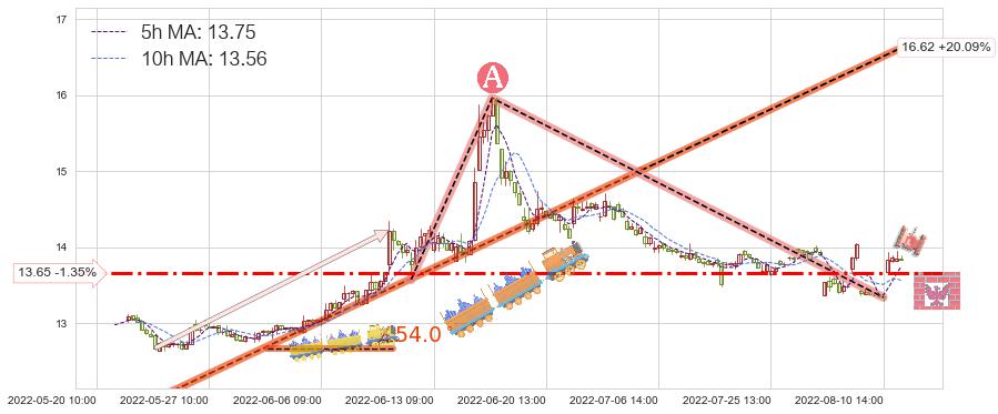 2022-07-22: 第一支撑位13.65有效抑制了下跌浪,成功阻止了价格的继续下跌。