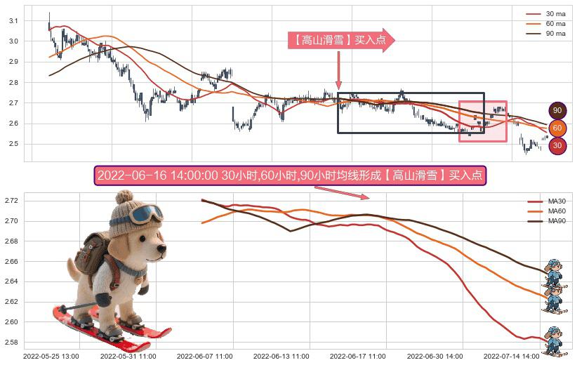 形态多维评估: ⚀ 2022-06-02 14:00:00小时-2022-07-15 14:00:00小时显现 30小时-60小时-90小时均线 【高山滑雪】买入点 看多信号,后市看涨,买入