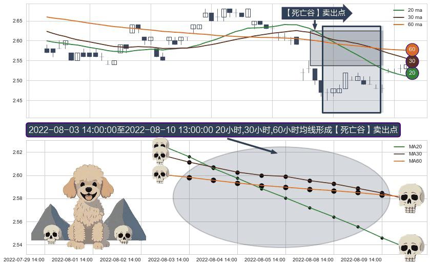 形态多维评估: ⚀ 2022-08-04 13:00:00-小时至2022-08-10 13:00:00-小时显现 20小时-30小时-60小时均线 【死亡谷】卖出点 看空信号,后市看跌,卖出