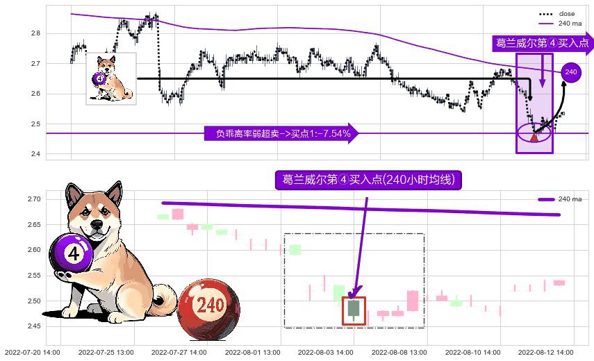 形态多维评估: ⚀ 2022-08-03 14:00:00-小时显现 葛兰威尔均线 240小时均线 第④买入点 下降趋势均值回复的短线反弹信号,后市看涨,买进信号