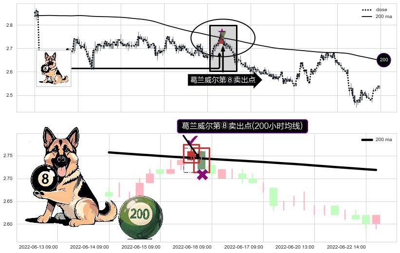 形态多维评估: ⚀ 2022-06-15 14:00:00-小时显现 葛兰威尔均线 200小时均线 第⑧卖出点 下降趋势的中继信号,后市看跌,卖出信号