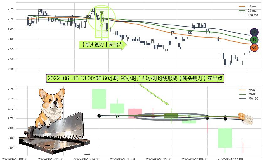 形态多维评估: ⚀ 2022-06-16 13:00:00小时显现 60小时-90小时-120小时均线 【断头铡刀】卖出点 看空信号,后市看跌,卖出