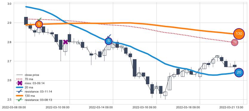 下跌趋势03-08 09:00-03-21 13:00,均线130, 20确认关键阻力2处