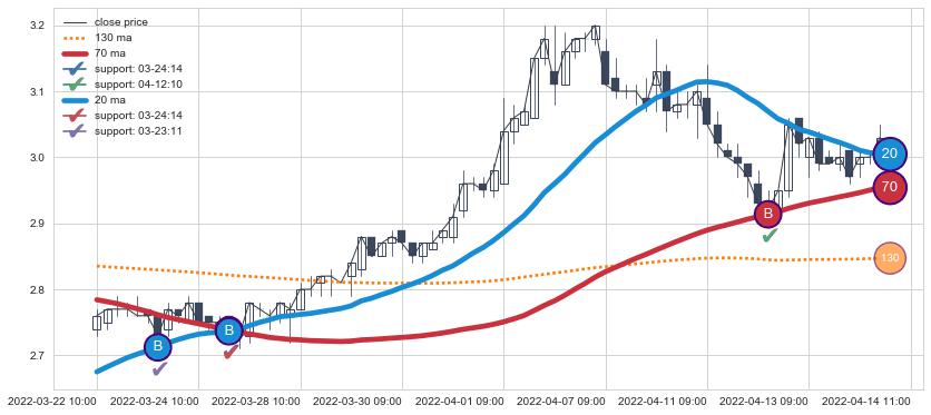 上涨趋势03-22 10:00-04-14 11:00,均线20, 70确认关键支撑3处