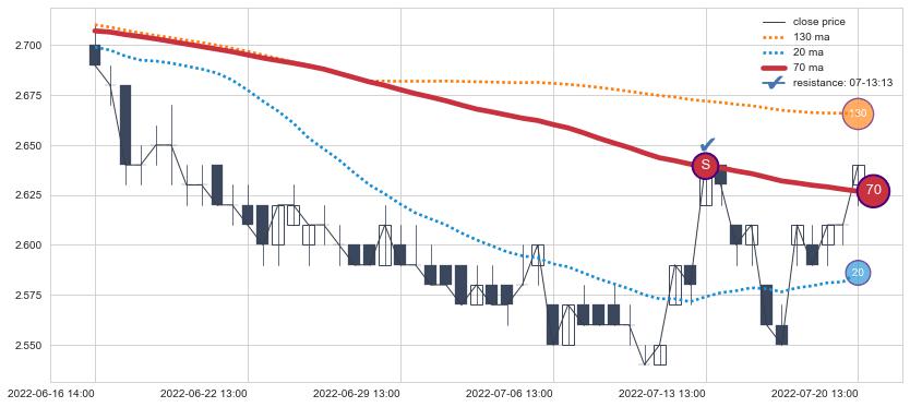 下跌趋势06-16 14:00-07-20 13:00,均线70确认关键阻力1处