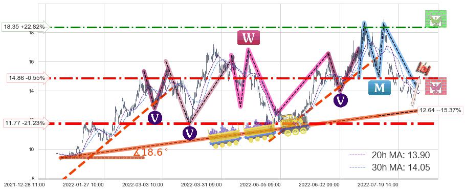 ♞ 20小时均线:13.90,30小时均线:14.05→ 快线<慢线