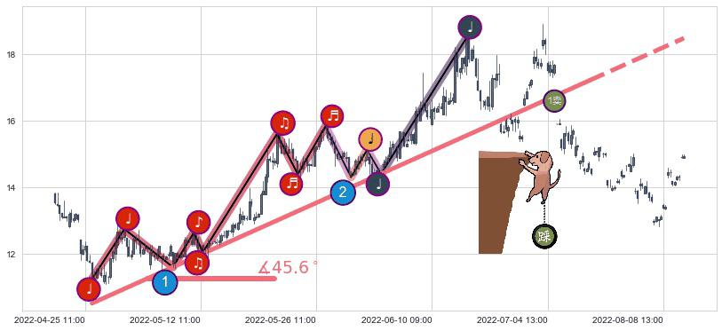 从2022-04-26 09:00至2022-07-15 13:00,共包含216个小时,阶段股价上涨31.39%,阶段股价变动位移路程比: 1 : 10,上涨趋势角度: 45.6