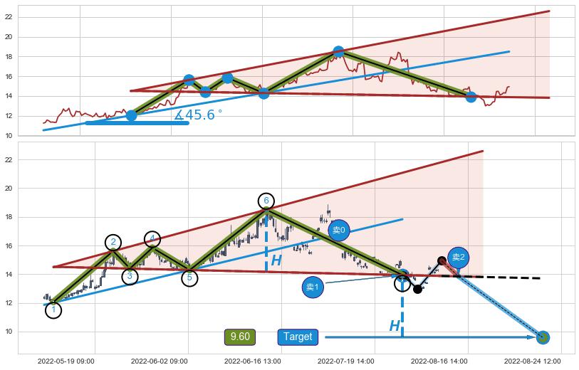 | 5 🅚:顶部尽头线(下山虎) ➕ 📐:扩散三角反转下行突破支撑位破位, 猜想持续下沉下跌,被突破的支撑位已变为阻力位 ☞ 看空信号 ⇥ 【🅚线】交织【图形】⇥ 综合量化分数: 46 | > |