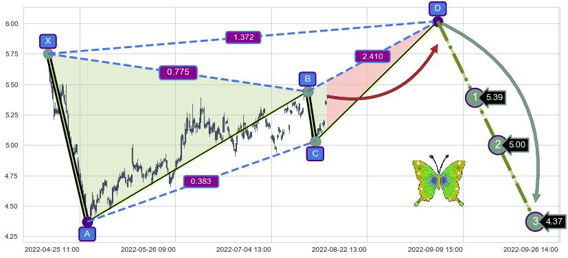 ➣ 未完成【蝴蝶】形态起点X: 04-14:14, 已到达C点: 08-04:13, 预测最终D点: 09-06:10, 共407交易小时