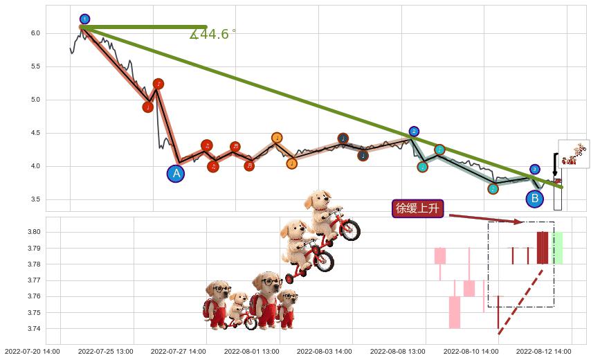 从2022-06-10 15:00至2022-08-12 13:00,共包含106个小时,阶段股价下跌-13.56%,阶段股价变动位移路程比: 1 : 4,下跌趋势角度: 46.7