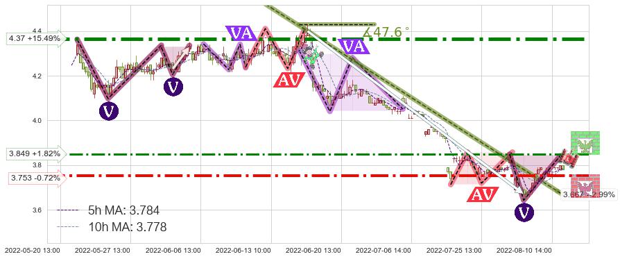 ♘ 阻力价格位3.849,可信任强度65.31%,距离最后交易2022-08-12 14:00形成的收盘价格3.780相差 +1.82%