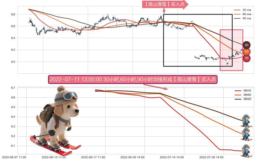 ⚀ 2022-06-16 11:00:00小时-2022-08-04 14:00:00小时显现 30小时-60小时-90小时均线 【高山滑雪】买入点 看多信号,后市看涨,买入