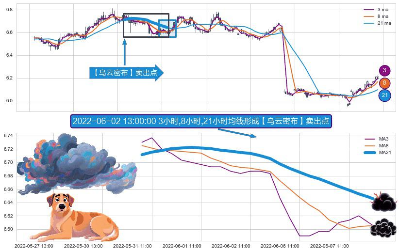 ⚀ 2022-05-31 10:00:00小时-2022-06-08 09:00:00小时显现 3小时-8小时-21小时均线 【乌云密布】卖出点 看空信号,后市看跌,卖出