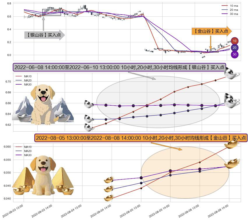 ⚀ 2022-08-05 14:00:00-小时至2022-08-08 14:00:00-小时显现 10小时-20小时-30小时均线 【金山谷】买入点 其再次确认了买入信号,可靠性更强,买入
