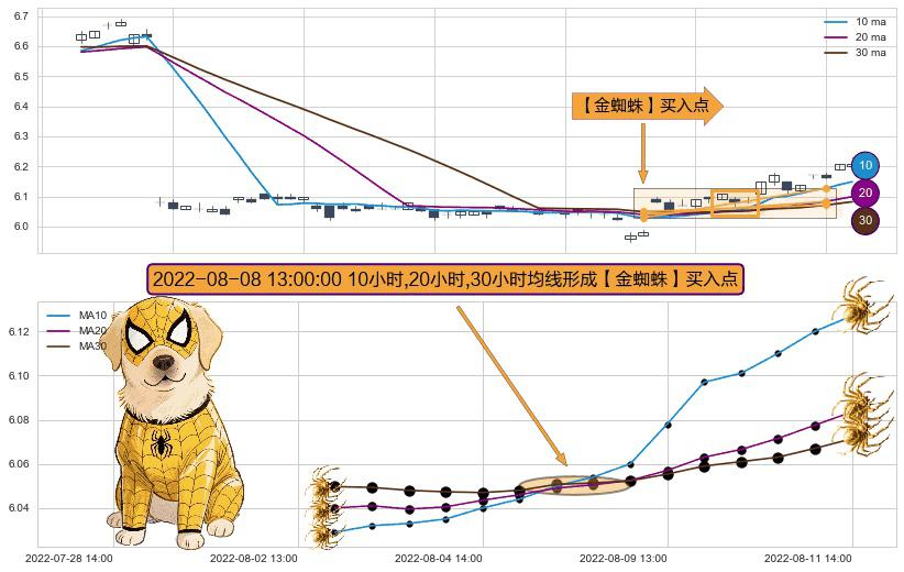 ⚀ 2022-08-08 13:00:00小时显现 10小时-20小时-30小时均线 【金蜘蛛】买入点 看多信号,后市看涨,买入