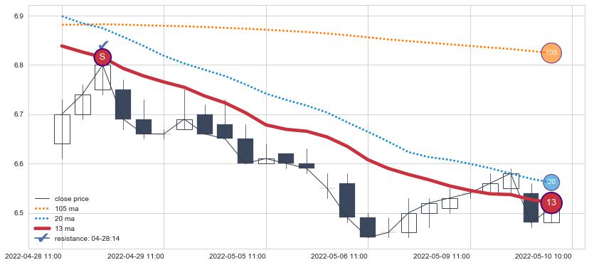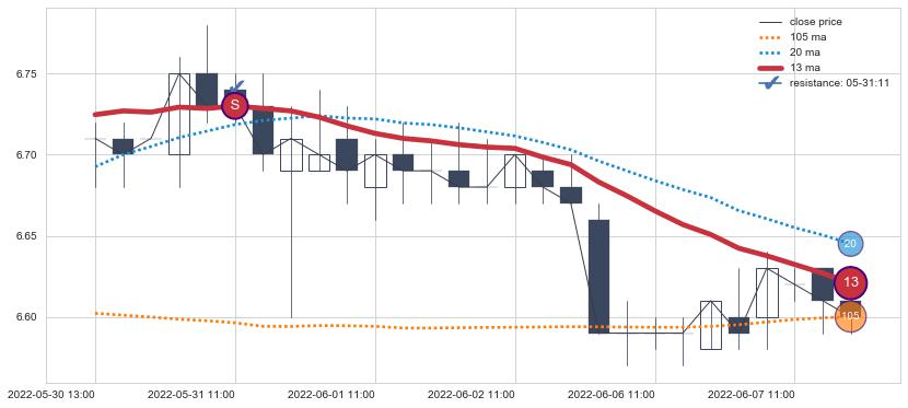 ⚃ 2022-07-20 14:00:00小时开盘价格在三条均线下收大阳线,收盘全突破均线,收盘股价上涨0.33%