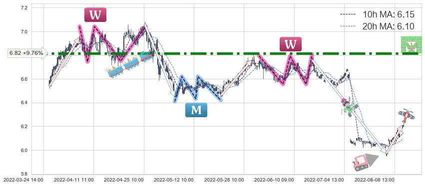 2022-06-15: 第一阻力位6.82起到了持续的阻力作用,有效地促进了价格的回落。