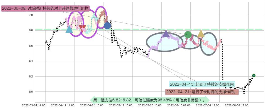 ♘ 阻力价格位6.82,可信任强度96.48%,距离最后交易2022-08-12 14:00形成的收盘价格6.21相差 +9.76%