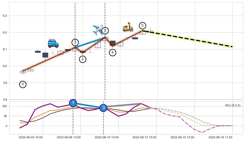 ➣ 第一, 三驱动浪端点:【KDJ】走势出现【常规背离 & 反转信号】背离程度51.98%,背离夹角角度68.6˚,背离程度中等