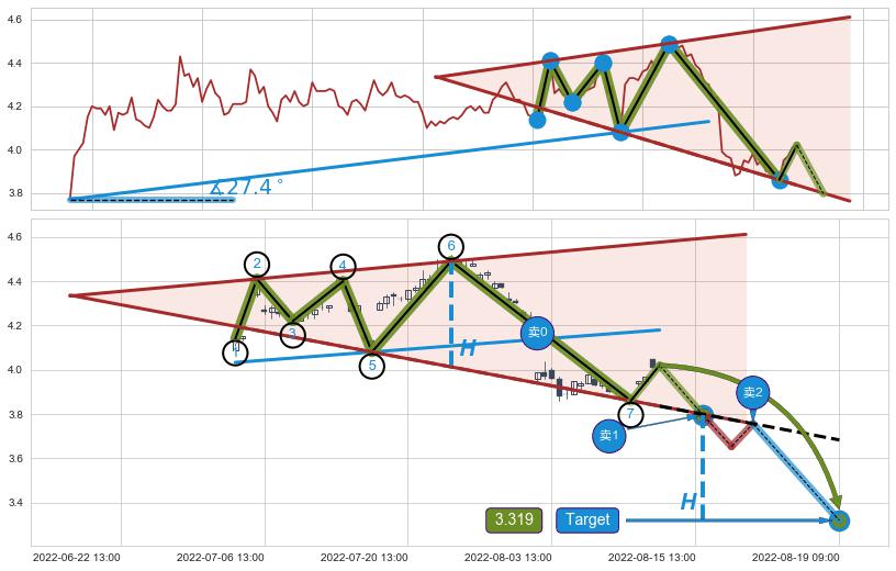 从2022-05-23 10:00至2022-05-26 09:00,共包含14个小时,阶段股价上涨5.86%,阶段股价变动位移路程比: 1 : 2