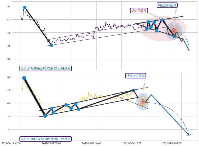 | 2 📈:趋势线支撑位已破位下跌 ➕ 📐:扩散三角反转临近支撑猜想转换阻力下跌 ☞ 看空信号 ⇥ 【图形】交织【图形】⇥ 综合量化分数: 41 | > |