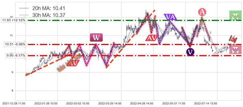 ♘ 支撑价格位10.51,可信任强度82.11%,距离最后交易2022-08-12 14:00形成的收盘价格10.55相差 -0.36%