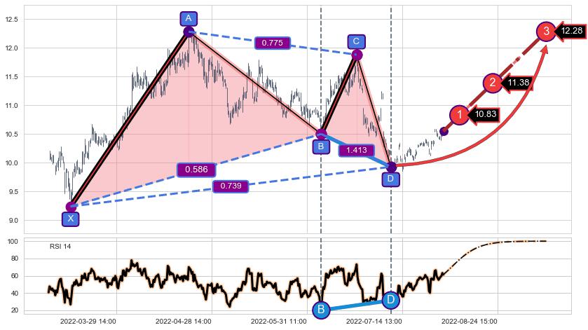 ➢ 谐波价格D点比B点低 ⤵,【RSI】指标D点比B点高 ⤴️