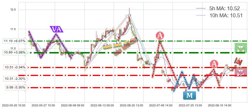 ♘ 支撑价格位10.51,可信任强度78.52%,距离最后交易2022-08-12 14:00形成的收盘价格10.55相差 -0.34%