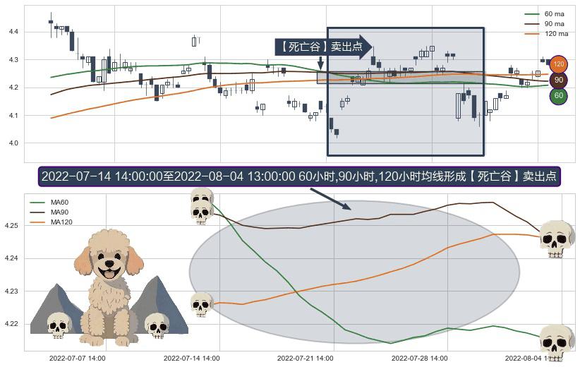 ⚀ 2022-07-15 13:00:00-小时至2022-08-04 13:00:00-小时显现 60小时-90小时-120小时均线 【死亡谷】卖出点 看空信号,后市看跌,卖出