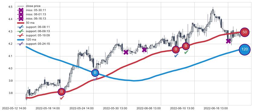 ⚂ 2022-06-22 14:00:00-小时均线向下破位,2022-08-11 13:00:00-小时重新上穿突破均线,均线支撑再次生效