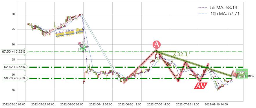 ♘ 阻力价格位58.76,可信任强度76.82%,距离最后交易2022-08-12 14:00形成的收盘价格58.58相差 +0.30%