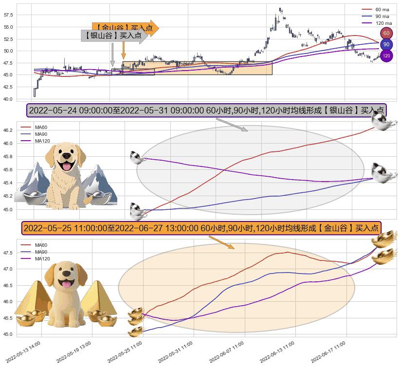 ⚀ 2022-05-25 13:00:00-小时至2022-06-27 13:00:00-小时显现 60小时-90小时-120小时均线 【金山谷】买入点 其再次确认了买入信号,可靠性更强,买入