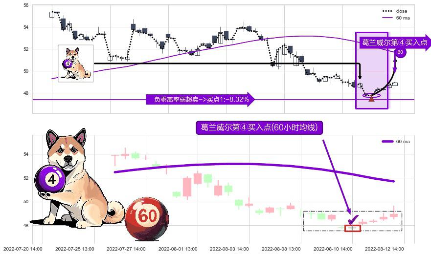 ⚀ 2022-08-10 14:00:00-小时显现 葛兰威尔均线 60小时均线 第④买入点 下降趋势均值回复的短线反弹信号,后市看涨,买进信号