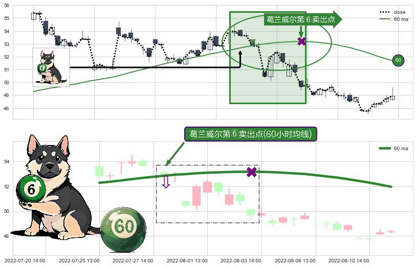 ⚀ 2022-07-28 13:00:00-小时显现 葛兰威尔均线 60小时均线 第⑥卖出点 走势反转见顶信号,后市看跌,卖出信号