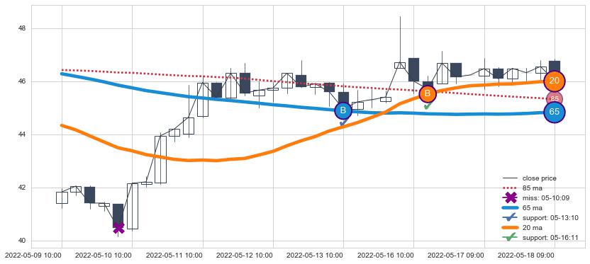 ⚃ 2022-07-21 14:00:00小时开盘价格在三条均线上收大阴线,收盘全跌破均线,收盘股价下跌-0.82%