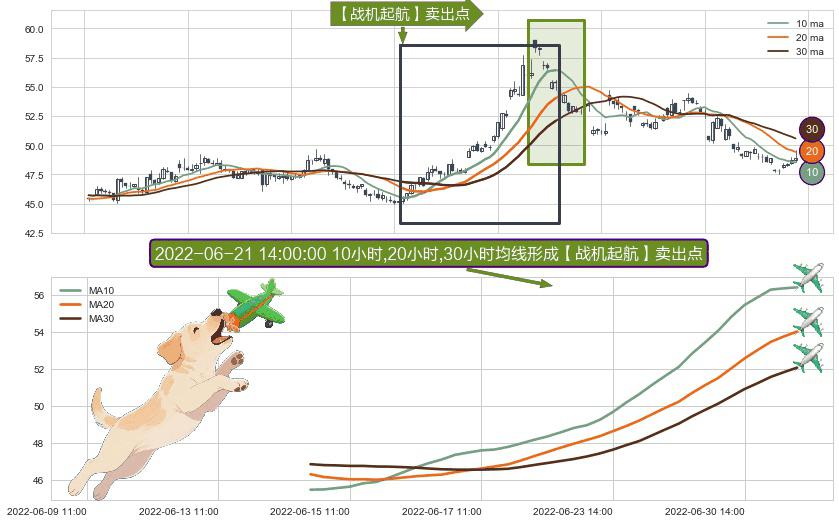 ⚀ 2022-06-14 14:00:00小时-2022-07-04 14:00:00小时显现 10小时-20小时-30小时均线 【战机起航】卖出点 看空信号,后市看跌,卖出