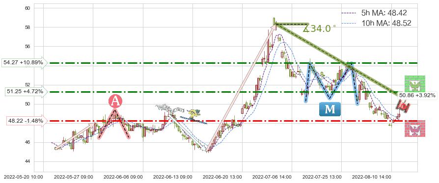 ♘ 支撑价格位48.22,可信任强度68.95%,距离最后交易2022-08-12 14:00形成的收盘价格48.94相差 -1.48%