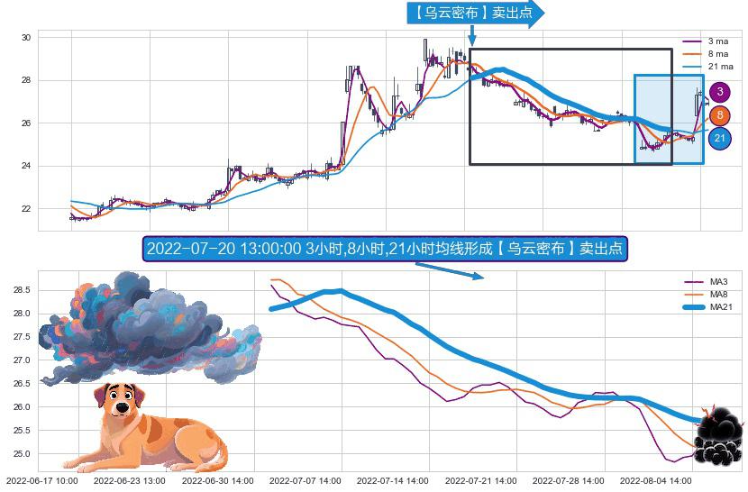 ⚀ 2022-07-01 14:00:00小时-2022-08-05 14:00:00小时显现 3小时-8小时-21小时均线 【乌云密布】卖出点 看空信号,后市看跌,卖出