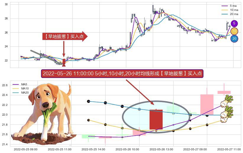 ⚀ 2022-05-26 11:00:00小时显现 5小时-10小时-20小时均线 【旱地拔葱】买入点 看多信号,后市看涨,买入