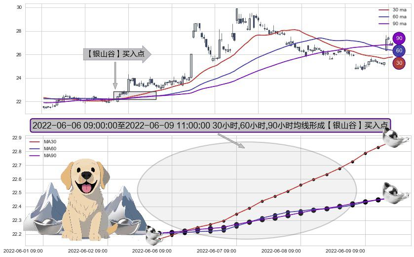 ⚀ 2022-06-06 10:00:00-小时至2022-06-09 11:00:00-小时显现 30小时-60小时-90小时均线 【银山谷】买入点 看多信号,后市看涨,买入