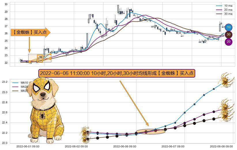 ⚀ 2022-06-06 11:00:00小时显现 10小时-20小时-30小时均线 【金蜘蛛】买入点 看多信号,后市看涨,买入