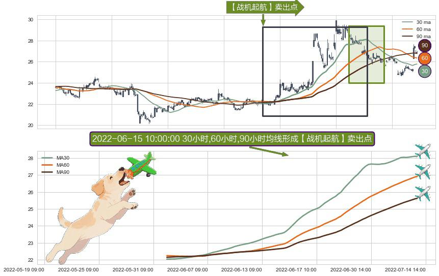 ⚀ 2022-06-01 09:00:00小时-2022-07-13 13:00:00小时显现 30小时-60小时-90小时均线 【战机起航】卖出点 看空信号,后市看跌,卖出