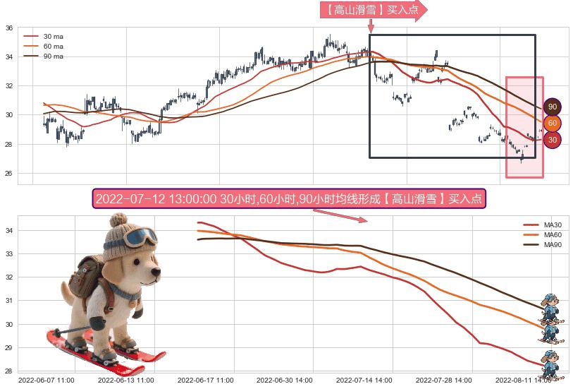 ⚀ 2022-06-15 13:00:00小时-2022-08-10 14:00:00小时显现 30小时-60小时-90小时均线 【高山滑雪】买入点 看多信号,后市看涨,买入